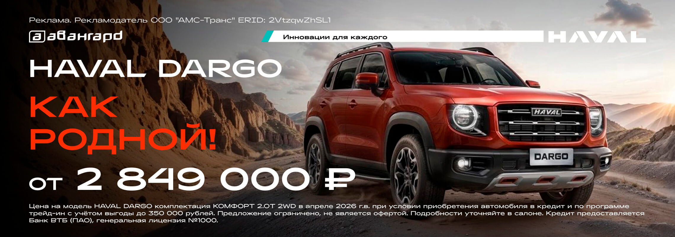 *Цена на модель HAVAL DARGO в апреле 2026 г.в. в комплектации Comfort 2.OT 2WD, при условии приобретения автомобиля в кредит и по программе трейд-ин с учётом выгоды до 600 000 рублей. Предложение ограничено, не является офертой. Подробности уточняйте в салоне. Кредит предоставляется Банк ВТБ (ПАО), генеральная лицензия №1000.