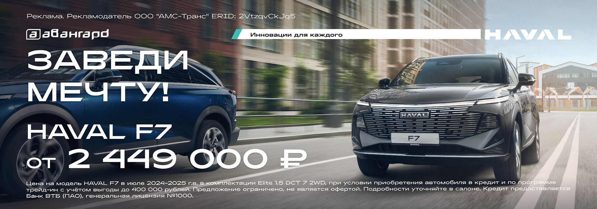 *Цена на модель HAVAL F7 в июле 2024-2025 г.в. в комплектации Elite 1.5 DCT 7 2WD, при условии приобретения автомобиля в кредит и по программе трейд-ин с учётом выгоды до 400 000 рублей.