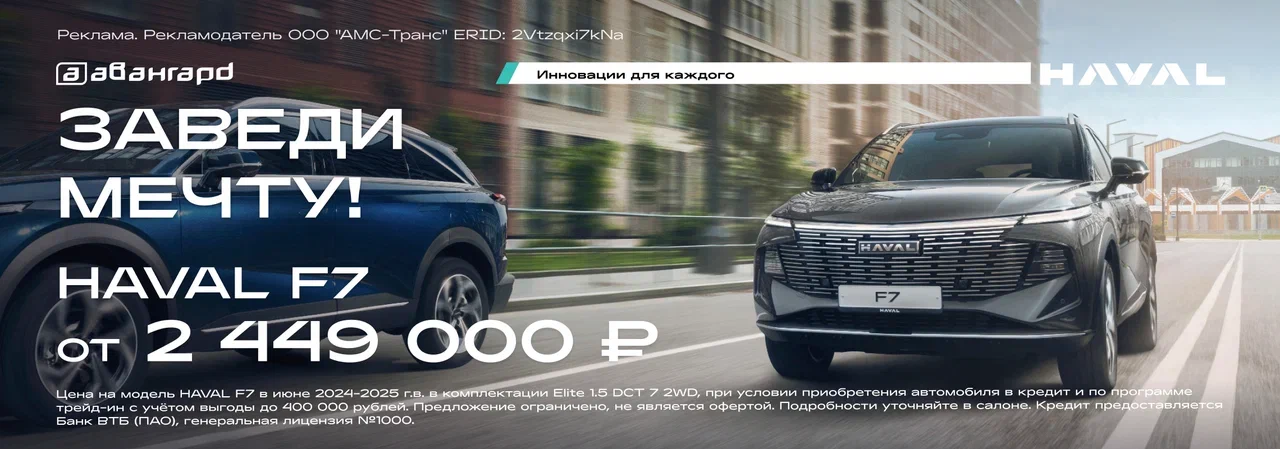 *Цена на модель HAVAL F7 в июне 2024-2025 г.в. в комплектации Elite 1.5 DCT 7 2WD, при условии приобретения автомобиля в кредит и по программе трейд-ин с учётом выгоды до 400 000 рублей.