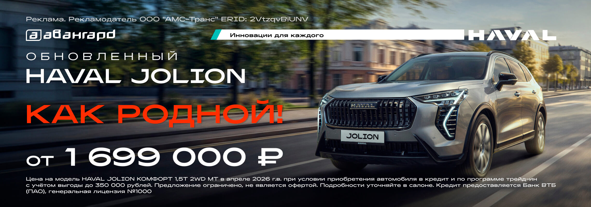 *Цена на модель HAVAL Jolion в апреле 2026 г.в. в комплектации Comfort 1,5T 2WD MT, при условии приобретения автомобиля в кредит и по программе трейд-ин с учётом выгоды до 600 000 рублей. Предложение ограничено, не является офертой. Подробности уточняйте в салоне. Кредит предоставляется Банк ВТБ (ПАО), генеральная лицензия №1000.