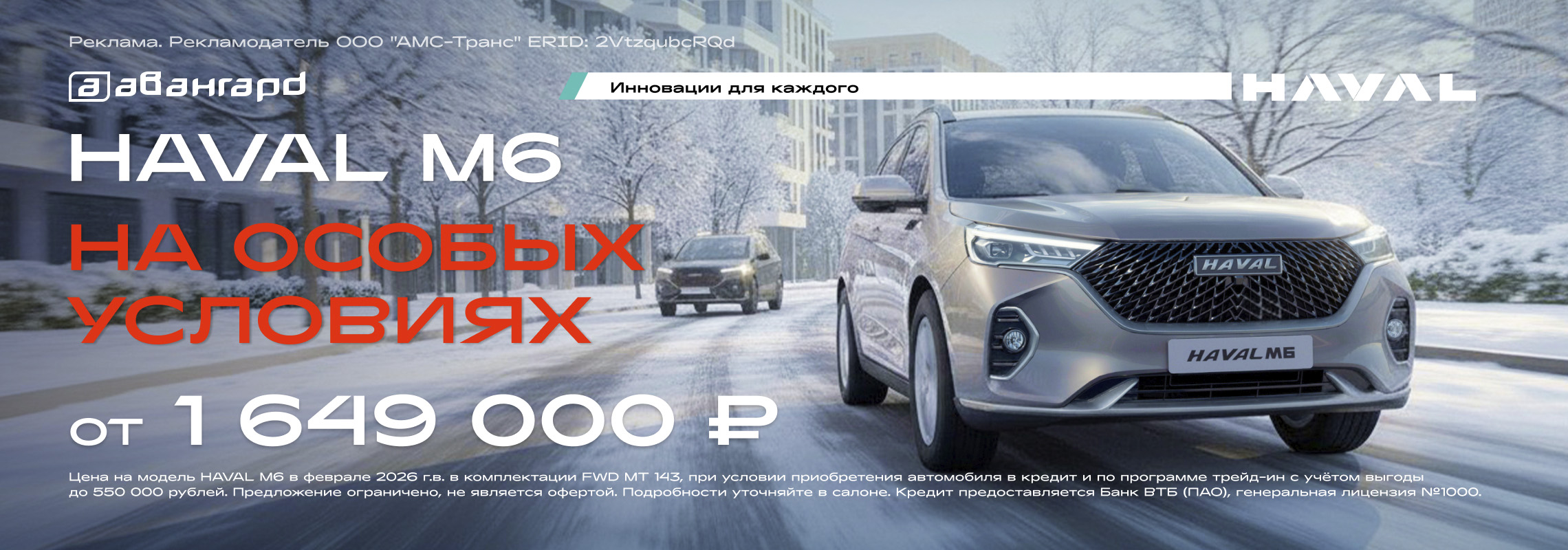 *Цена на модель HAVAL M6 до 28 февраля включительно 2025 г.в. в комплектации FWD МТ 143, при условии приобретения автомобиля в кредит и по программе трейд-ин с учётом выгоды до 550 ООО рублей. Предложение ограничено, не является офертой. Подробности уточняйте в салоне. Кредит предоставляется Банк ВТБ (ПАО), генеральная лицензия №1000.