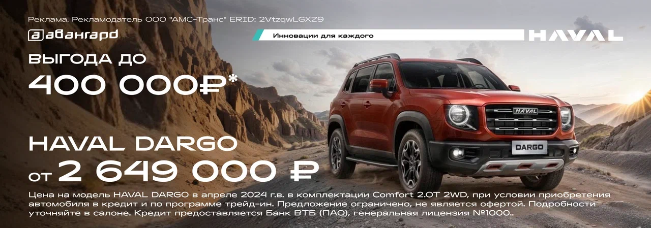 *Цена на модель HAVAL DARGO в апреле 2024 г.в. в комплектации Comfort 2.OT 2WD, при условии приобретения автомобиля в кредит и по программе трейд-ин.